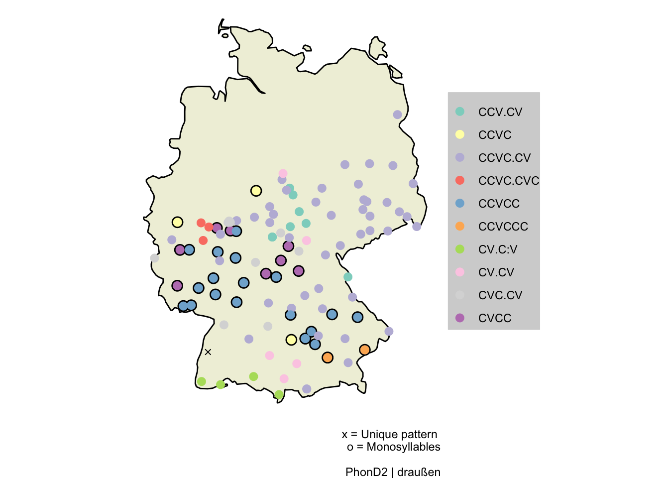 The following map gives an overview of regional differences in the CV structure of the lemma draußen. This representation is only intended as an impression of the phonotactic diversity of dialects based on unclassified data. Further information for spatial analyses are provided by the tables below.